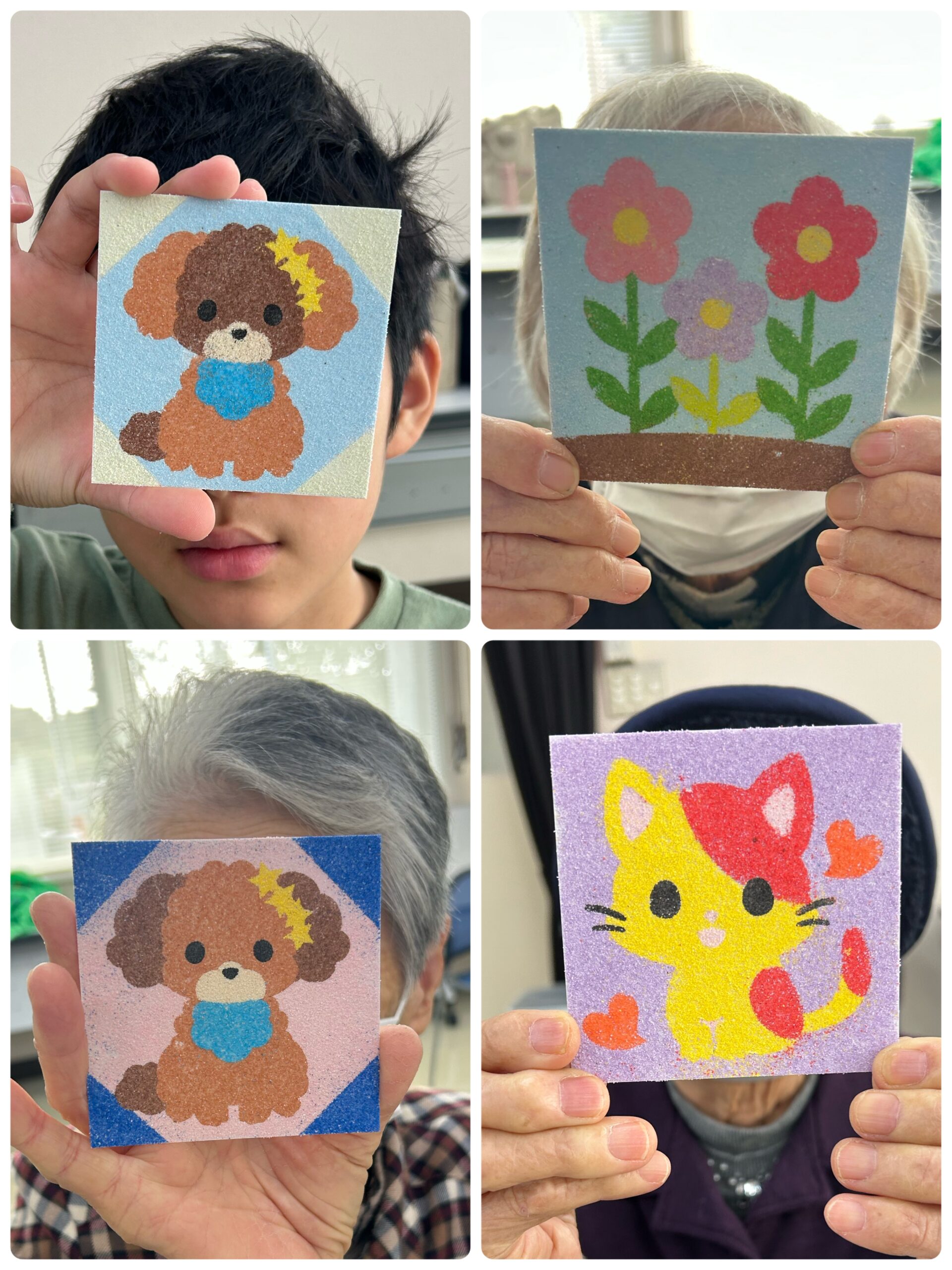 11/11(火)「おたっしゃ教室」にて砂絵教室を開催させていただきました 投稿日: 2025年11月12日 投稿者: sunaeowner 11/11(火)は、御前崎市の比木センター様「おたっしゃ教室」にて、砂絵教室を開催させていただきました。 最初は「できるかな?」と心配されていた利用者さんも、ボランティアの皆さんにお手伝いいただきながら、笑顔で楽しんでくださいました。 参加してくださった皆様、ボランティアの皆様、そして担当のY様、本当にありがとうございました! 皆さんの作品は文化展で展示していただけるそうです。多くの方に見ていただけるのがとても嬉しいです。