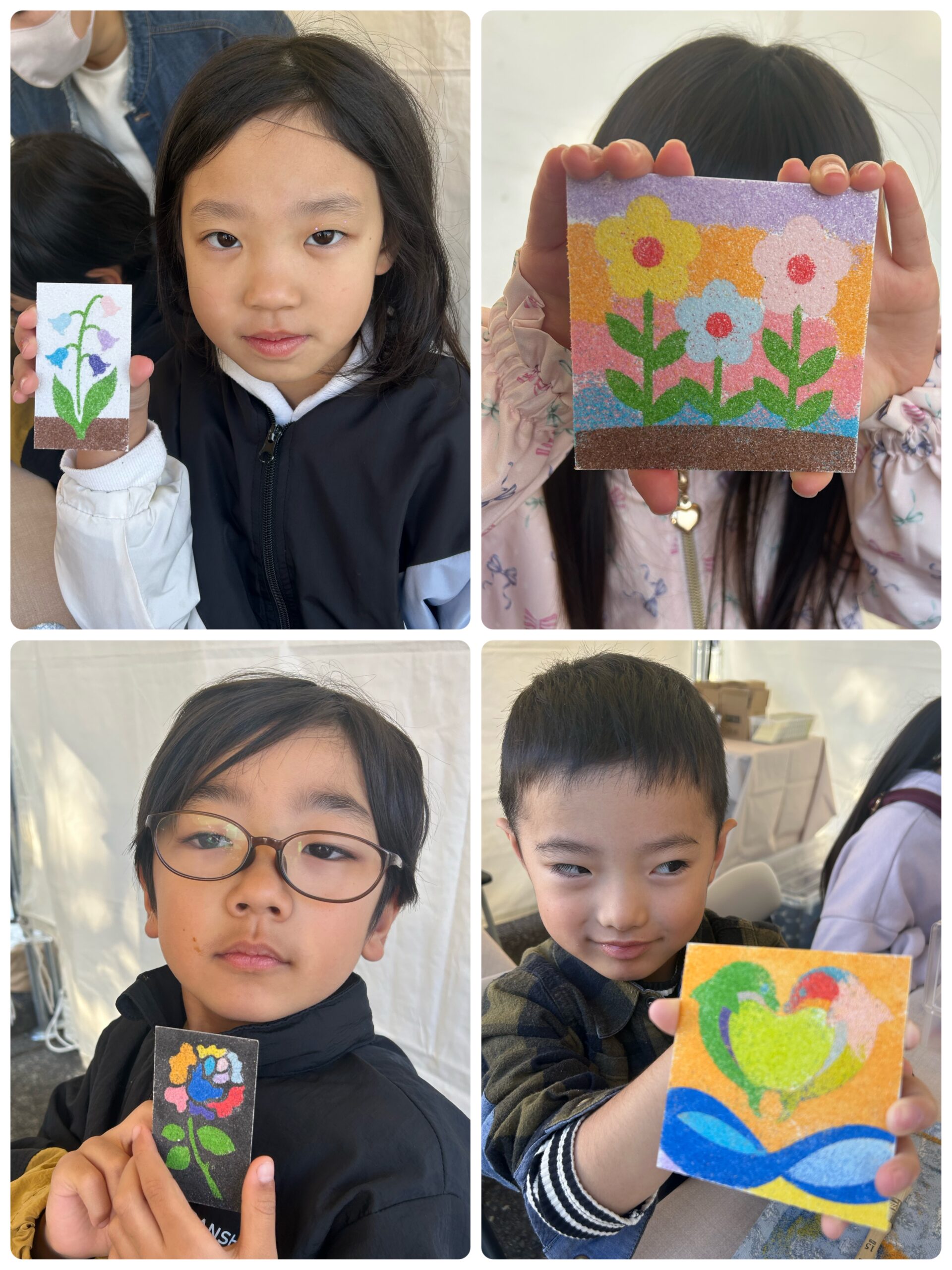 11/22(土)、御前崎市の「大産業まつり」に出店しました 投稿日: 2025年11月28日 投稿者: sunaeowner 11/22(土)は、御前崎市の「大産業まつり」の一日目でした。 よいお天気で、風が無く、とても穏やかな日でした。 ワークショップに参加してくださった皆様、砂絵キットをご購入くださった皆様、本当にありがとうございました。 たくさんのお客様が作ってくださった作品をぜひご覧ください。 翌日の二日目に続きます。