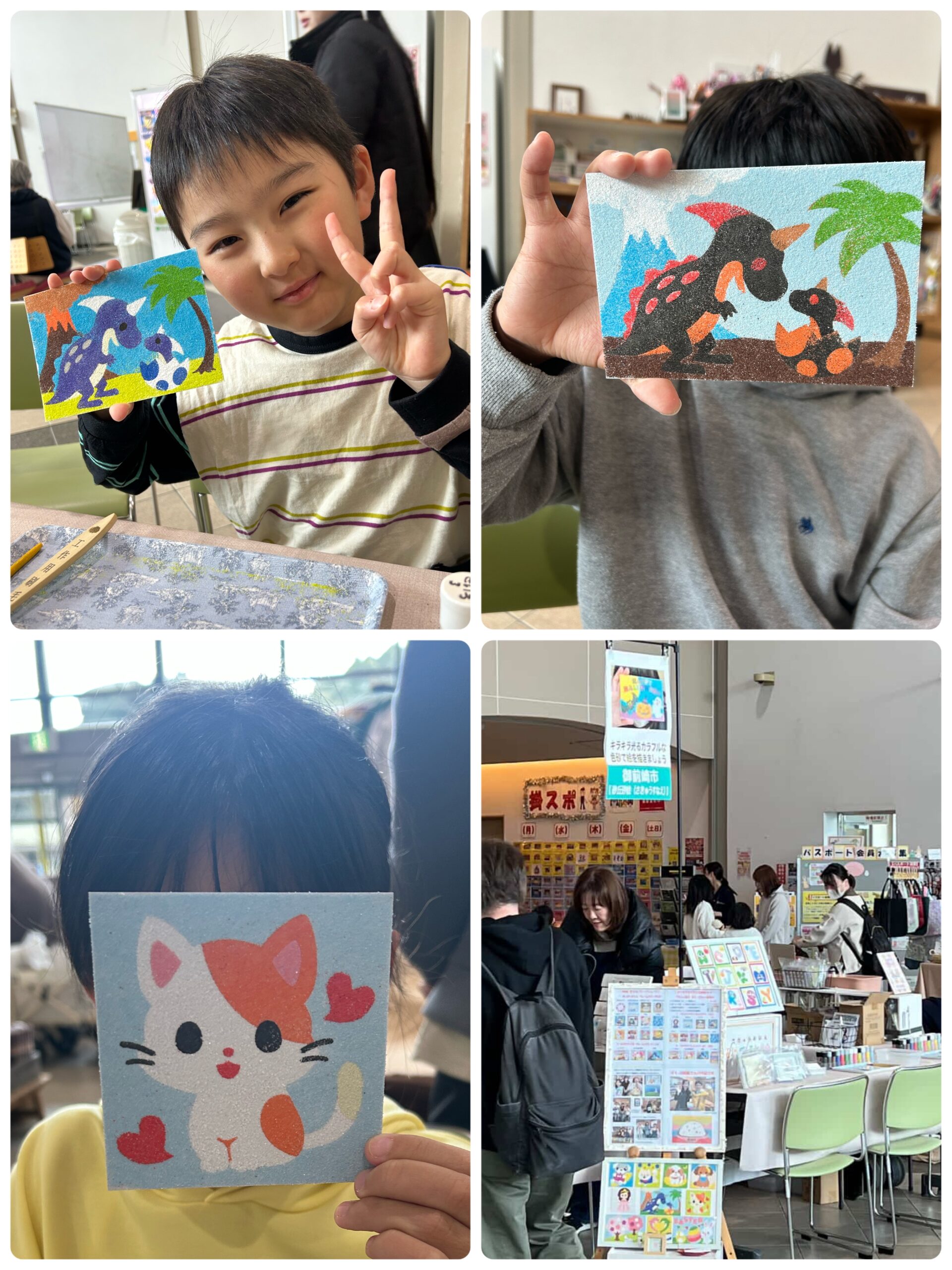 3/15(日)「さんりーなマルシェ」に出店しました 投稿日: 2026年3月17日 投稿者: sunaeowner 3/15(日)掛川市総合体育館さんりーな様での「さんりーなマルシェ」に出店いたしました 砂絵アートのワークショップに参加してくださった皆様、そして砂絵キットをご購入くださった皆様、ありがとうございました。 私の担当ネイリストさんのお嬢さんが砂絵好きとのことで遊びに来てくださいました! 他にも初めましての方、二度目ましての方に砂絵アートを楽しんでもらえて嬉しかったです♪ 出店者様達ともお話しできて楽しい時間を過ごせました。 さんりーなスタッフの皆様、担当のW様、事前のチラシ作成から当日の準備、片付けまで大変お世話になりまして、ありがとうございました。