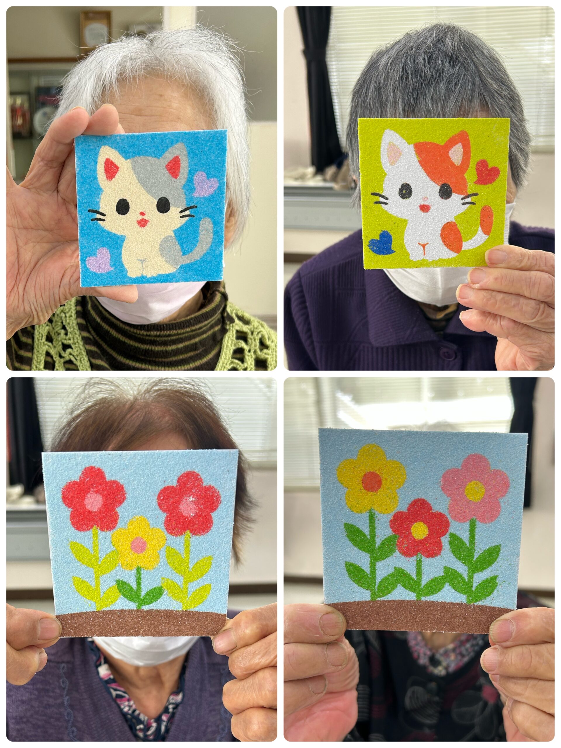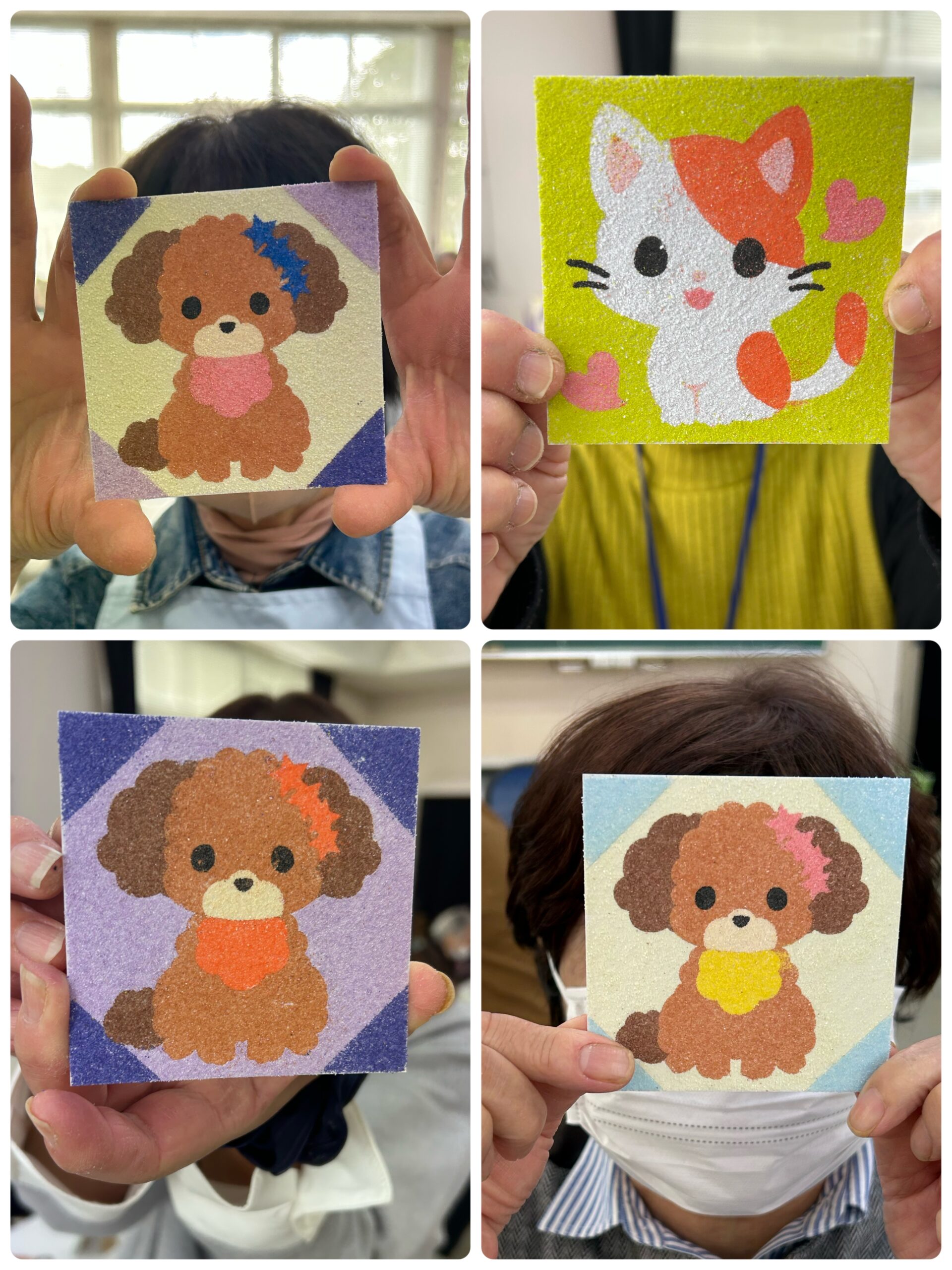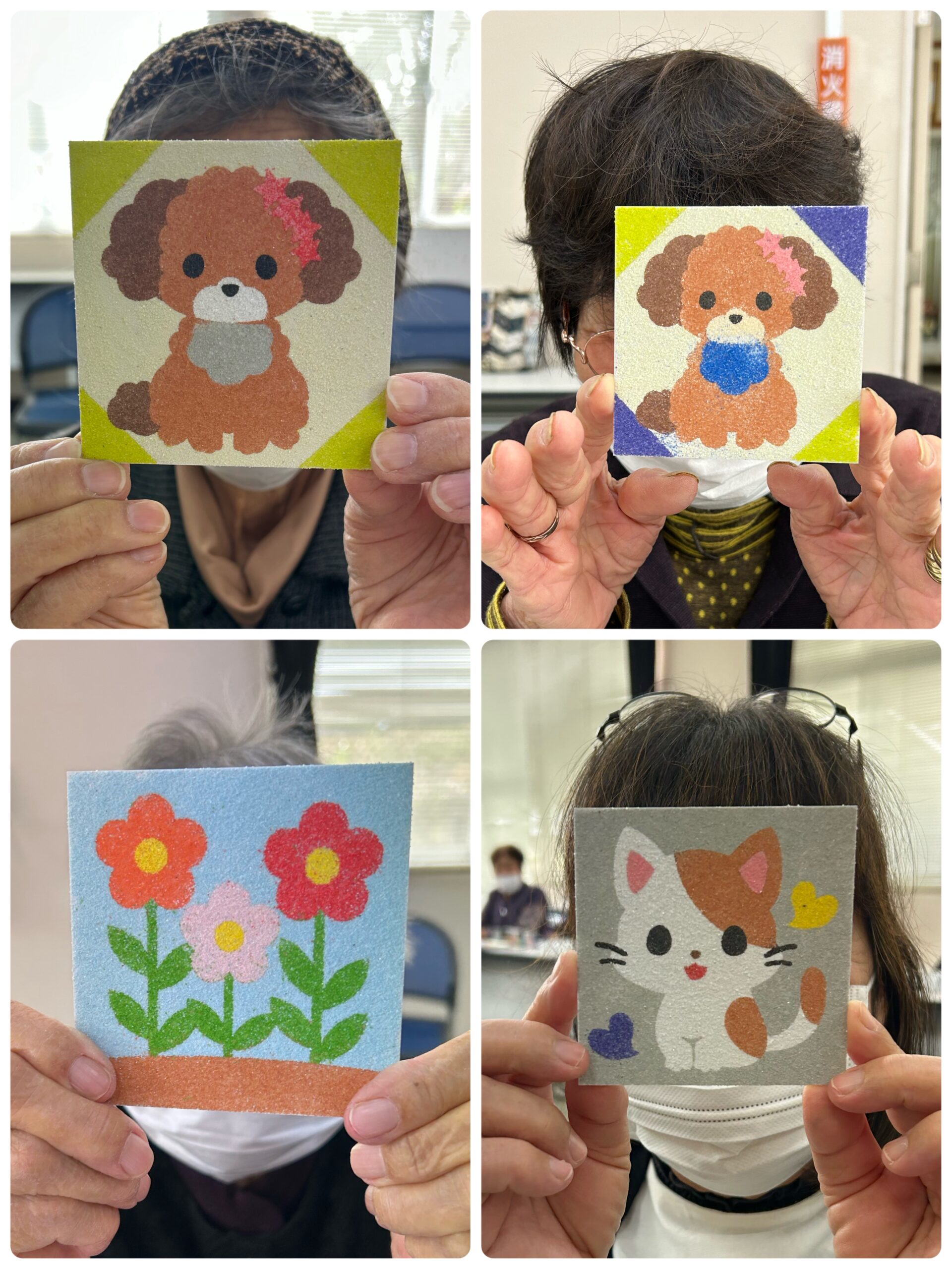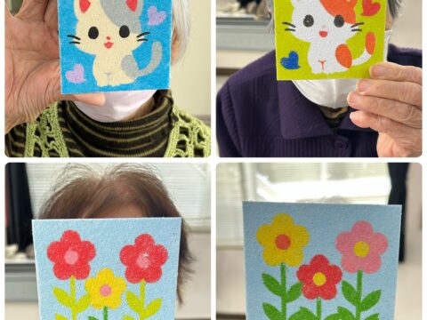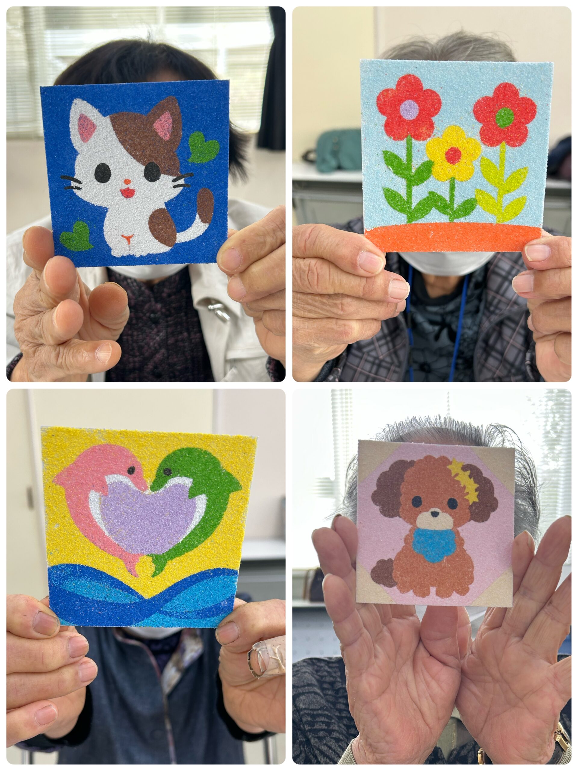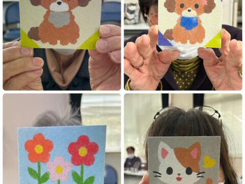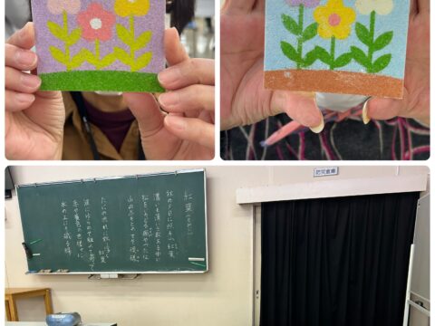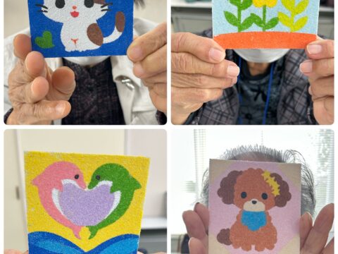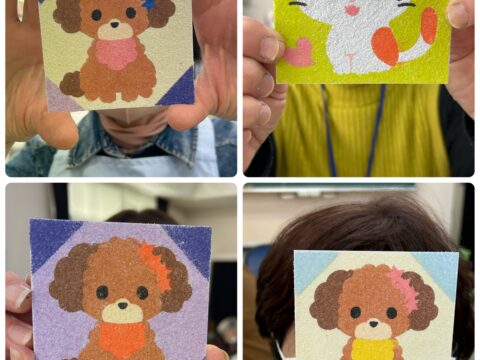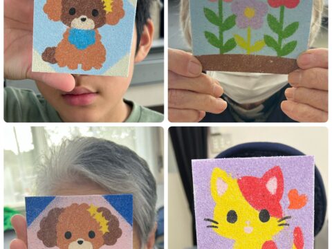 11/11(火)「おたっしゃ教室」にて砂絵教室を開催させていただきました 投稿日: 2025年11月12日 投稿者: sunaeowner 11/11(火)は、御前崎市の比木センター様「おたっしゃ教室」にて、砂絵教室を開催させていただきました。 最初は「できるかな?」と心配されていた利用者さんも、ボランティアの皆さんにお手伝いいただきながら、笑顔で楽しんでくださいました。 参加してくださった皆様、ボランティアの皆様、そして担当のY様、本当にありがとうございました! 皆さんの作品は文化展で展示していただけるそうです。多くの方に見ていただけるのがとても嬉しいです。