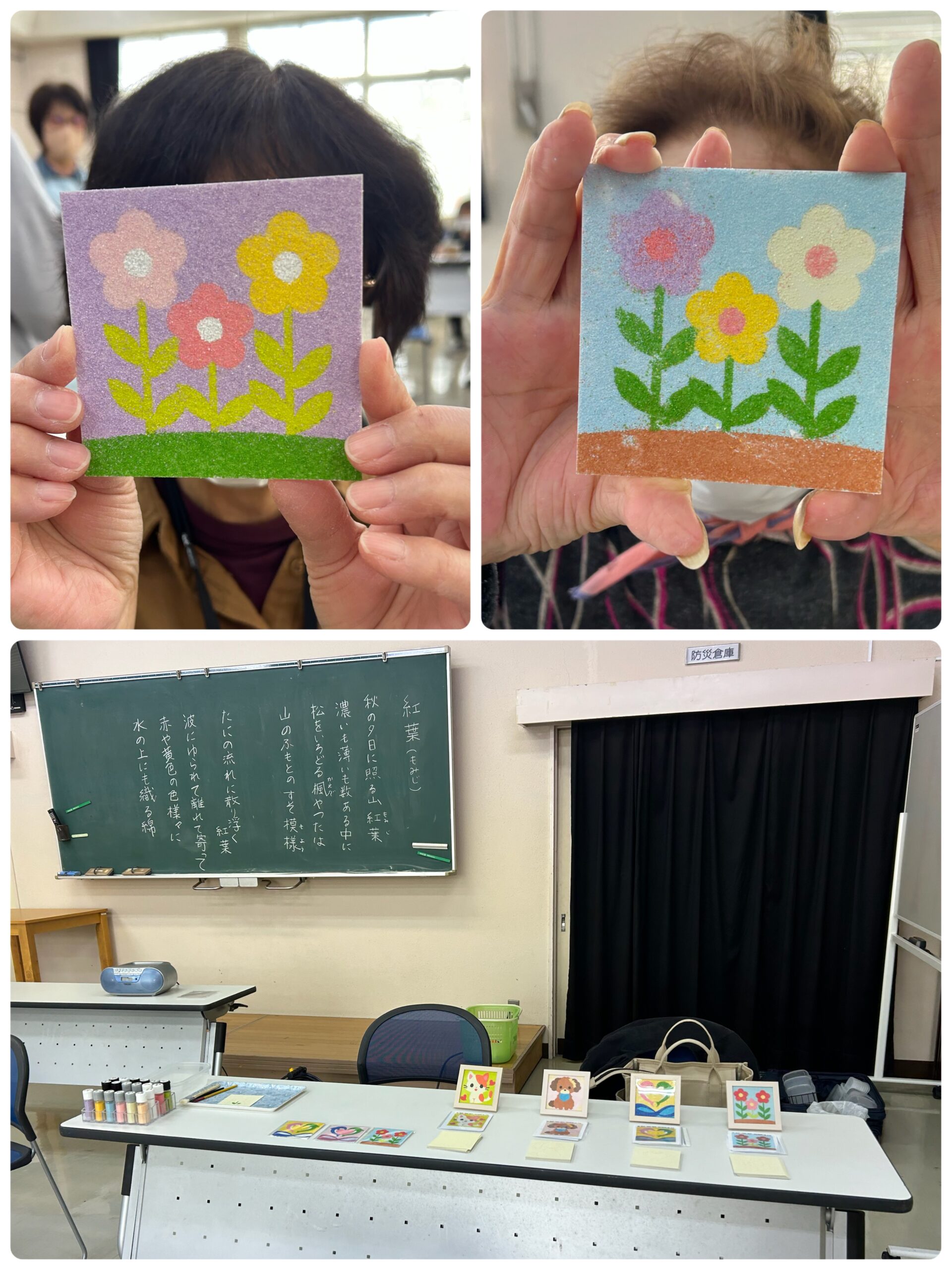 10/21(火)「楽らくクラブの砂絵教室」を開催させていただきました 投稿日: 2025年10月23日 投稿者: sunaeowner 10/21(火)、牧之原市の細江区コミュニティセンター様にて「楽らくクラブの砂絵教室」を開催させていただきました。 本来は先月の予定でしたが、9月5日の突風と大雨の影響で細江区は大きな被害を受け、コミュニティセンターも避難場所となっていたため、本日に延期となりました。 初めて細江区を通りましたが、幹線道路沿いには壁が吹き飛ばされ、中が見えるお店もあり… 自然災害の爪痕を目の当たりにして胸が痛みました。 教室には「絵心がないから心配」と話される方、ギプスをされている方、(突風の日から)手の震えが止まらない方など、さまざまな方が参加してくださいました。 ゆっくり時間をかけてお手伝いしながら進めたところ、完成した作品を見て皆さんが笑顔になり、「楽しかった!」と言ってくださって本当に嬉しかったです。 作品は一旦回収し、来月の文化祭でコミュニティセンター様に展示してくださいます お近くの方はぜひ見に行ってみてください。 参加してくださった皆様、担当のH様、スタッフの皆様、ありがとうございました。 まだ被害の跡が残る牧之原市に一日も早く安全で穏やかな日常が戻りますようにお祈り申し上げます。